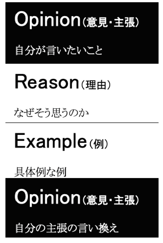 アメリカでは、小学生の頃には、文章をOREO(オレオ)で書くように指導されます(最後のOpinionは必須ではないので、実際にはOREの構造の英文が非常に多いです)。